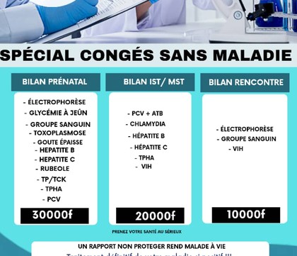 DIP'S LAB propose un bilan prenatal a 30 000 F regroupant plusieurs examens utiles au suivi de grossesse. L'offre visible sur les supports de communication comprend notamment l'electrophorese, la glycemie a jeun, le groupe sanguin, la toxoplasmose, la goutte epaisse, les hepatites B et C, la rubeole ainsi que le TP/TCK.